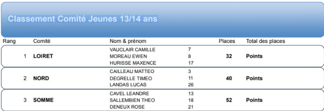 Nous pouvons saluer la victoire du Loiret en 13/14 ans et la 18ème place au classement inter-comité